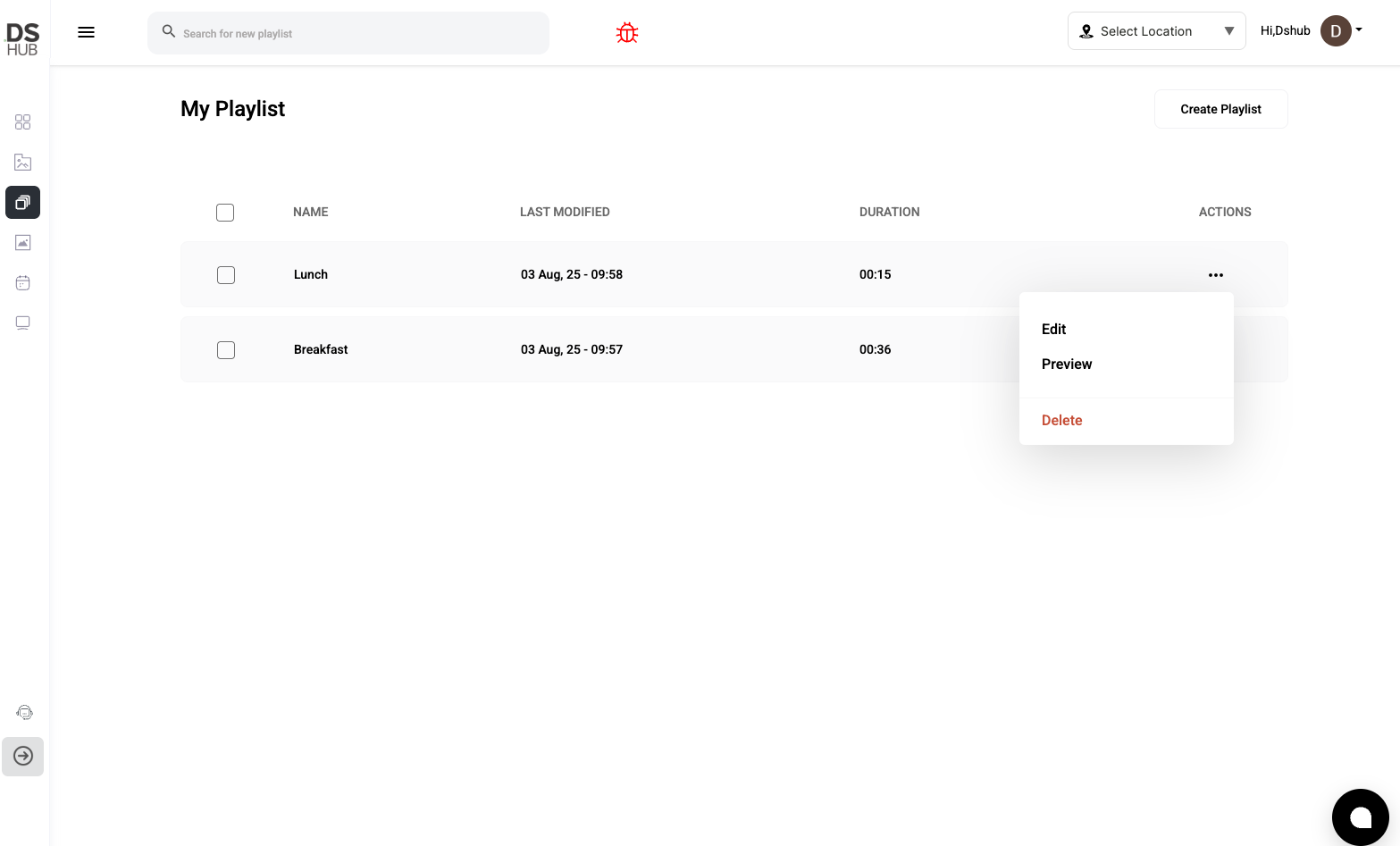 The Playlist Dashboard in DSHub is the central hub where you can view, manage, and create playlists. From here, you can easily edit playlists, preview them, and organize content for screens connected via DSPlayer.